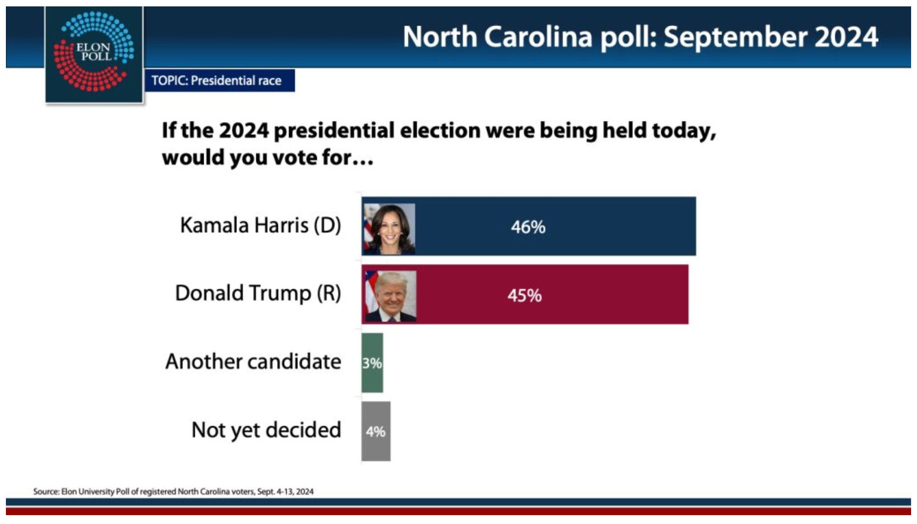 We’re six weeks from the election. If you are in North Carolina, you can stop watching the polls. The race is tied and it will remain so until we know the result. You might see a poll that says Harris is up by two or one that says Trump leads by three. In fact, you’re likely to see both between now and November 5. They don’t matter. For all practical purposes, the race is a dead heat and will be determined by who turns out to vote.