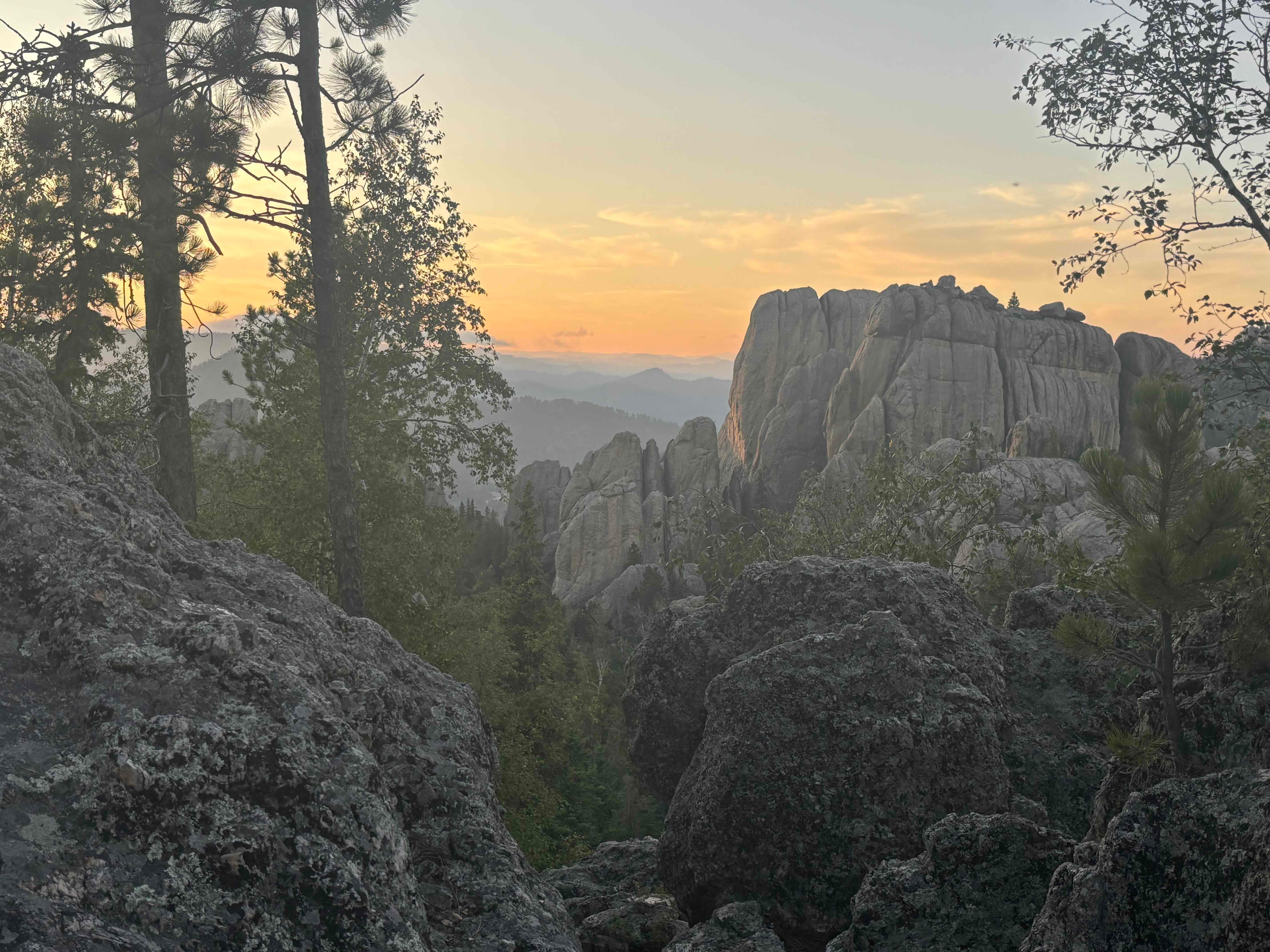 Custer State Park preserves a section of the Black Hills in South Dakota. Calvin Coolidge spent a summer there in a lodge that now serves as a visitor center. A wildlife loop provides refuge to a herd of buffalo, pronghorns, mountain goats, and bighorn sheep. Dramatic pointy rock formations define Needles Highway where two jagged tunnels appear to have been hacked through the mountain with picks and chisels. At the top of the drive, we ate dinner at a lodge that provides sunset views that rival any in the country.